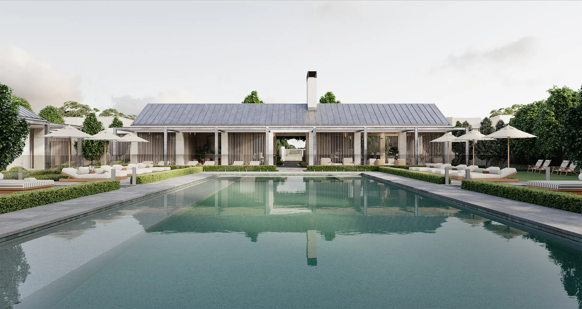 Resort-style additions including a covered pavilion with BBQ, lounging and dining spaces, plus a large pool with children’s play zone, day beds and outdoor lounges.